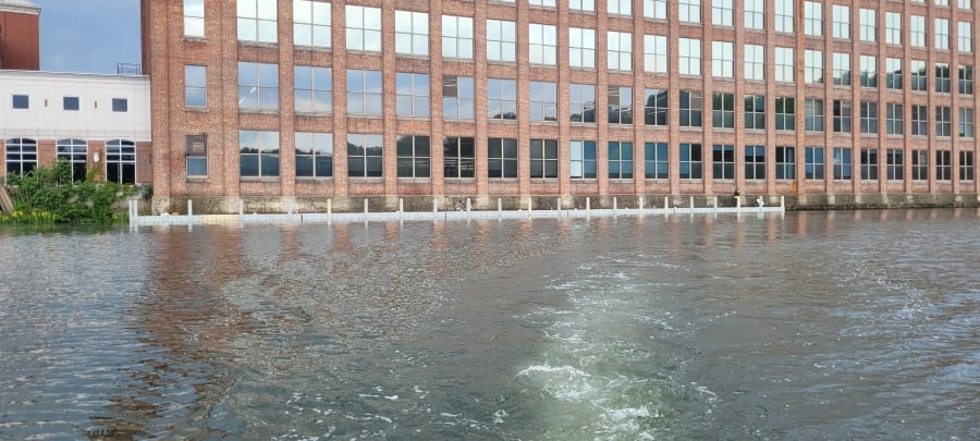 This 26-section work platform was created to hold scaffolding for building repairs. It is 10′ wide and 174′ long and has over 44,000 lbs of flotation capacity. The platform was repositioned as the work was completed along the side of the building. This project utilized our dock leasing option.